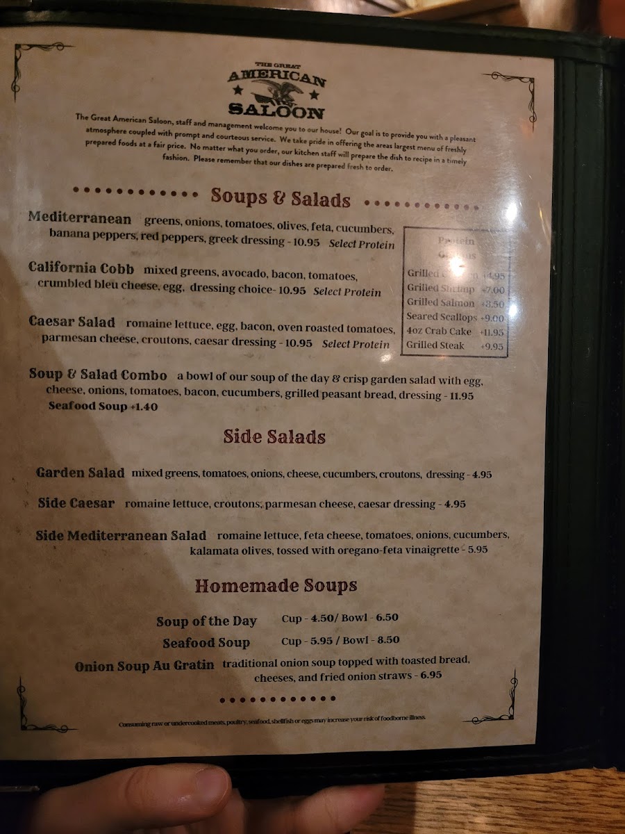 Nestled in Red Lion, PA, the Great American Saloon is a delightful dining destination that offers a rich taste of American cuisine. The menu boasts a variety of comforting dishes, from the hearty Onion Soup au Gratin to the refreshing Mediterranean Steak Salad. Guests can indulge in classics like a juicy American Burger or dive into the flavorful Cream of Crab Soup, filled with generous chunks of crab. The ambiance is inviting, marked by attentive service, as evidenced by reviews praising the friendly staff, especially hostess Ariyanna, who is noted for her attention to detail. Diners rave about the Gnocchi Carbonara and perfectly cooked ribeye, highlighting a memorable experience. With its blend of delectable food and welcoming atmosphere, the Great American Saloon is a pub-style eatery you won’t want to miss on your culinary adventures.